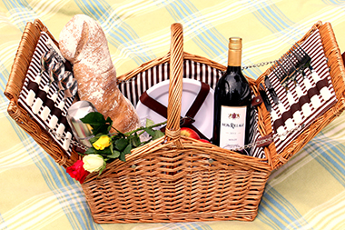 - Picknickkörbe beinhalten jeweils eine Flasche Wasser, Teller, Besteck und Gläser oder Becher.
