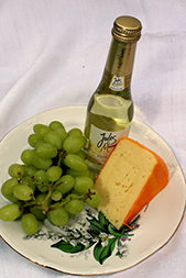französischer Rotwein, Bioapfelschorle oder Holunderlimo, Wasser, Wurzelbrot, Süssrahmbutter, Schwarzwälder Schinken, Käsewürfel (Gouda) mit Weintrauben, Cornichons, hausgemachte Marmelade, Sahnequark mit Kirschen - Traditioneller Bauernhofkorb