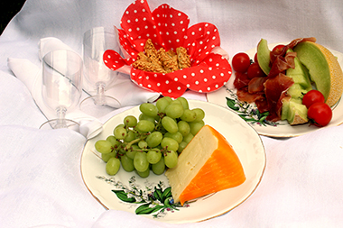 Zwei Piccolo Mumm Sekt (bei 4 Personen 0,75l Flasche), Saft, Wasser, Olivenringbrot, Brötchen, Tomate-Mozzarella-Spieße, Ziegenkäse mit Feigensenf, Antipasti, fruchtiger Geflügelsalat oder Thunfischdip, Grissinistangen, hausgemachte schwarze Olivenpaste, Melone mit Serranoschinken, Kuchen im Glas
